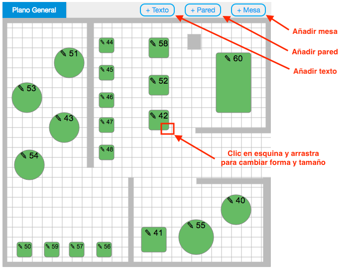 En el área de diseño puedes añadir mesas, elementos divisorios o paredes y modificar el tamaño y forma de las mesas: