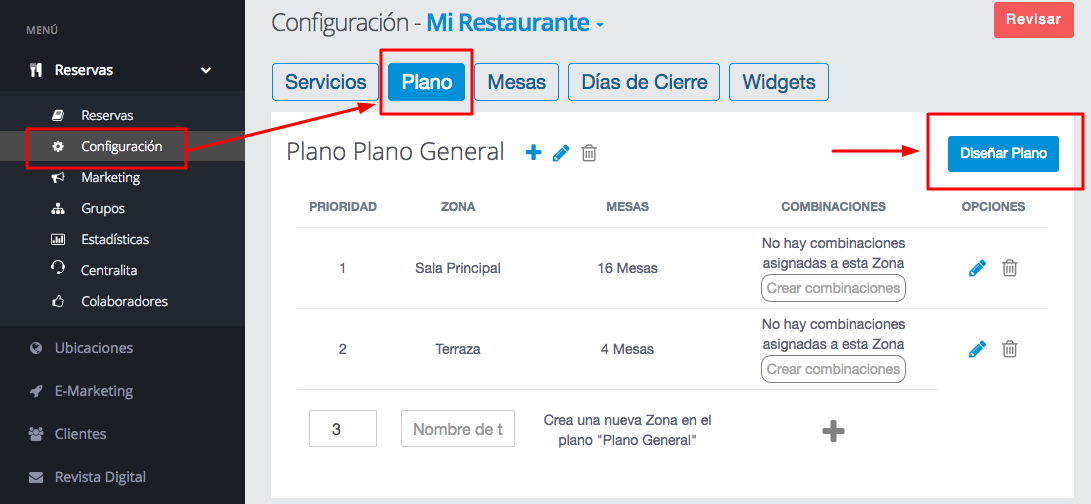 Para modificar el plano de tu restaurante ve al menú lateral "Configuración", "Plano" y haz clic en el botón "Diseñar plano"...