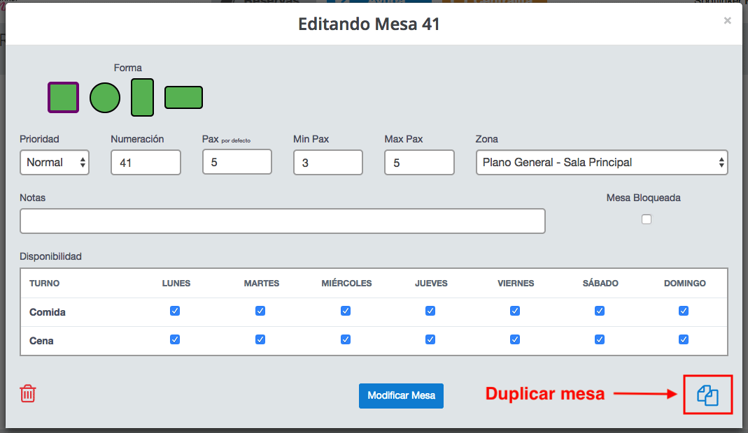 Haciendo clic en el lápiz de cada mesa accedes a su configuración: números de comensales por defecto, mínimo, máximo, nombre de la mesa, etc.